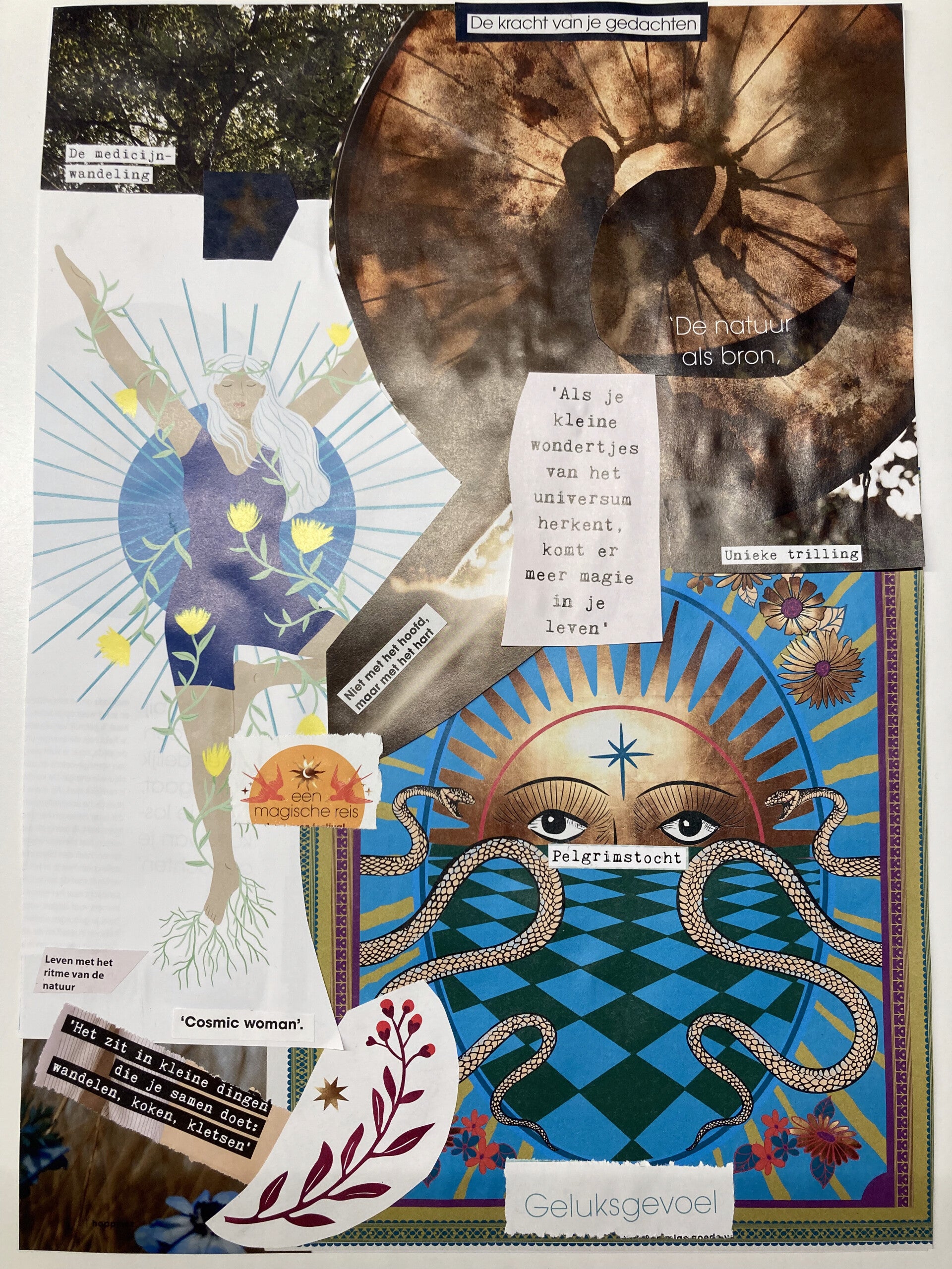 Je kan het opstellen van een moodboard zien als een soort ritueel waar een veld van gevoelens, beelden en energieën willen ontstaan. Terwijl je knipt, schuift en kiest, stem je je af op wat in je onderbewustzijn leeft. Onbewust ga je voor hetgeen dit jaar door jou heen wil bewegen. Bepaalde kleuren zullen je meer ademruimte geven dan andere kleuren en misschien resoneren bepaalde woorden wel. Je hoeft niet na te denken. Je handen volgen vaak al voordat je hoofd het begrijpt.